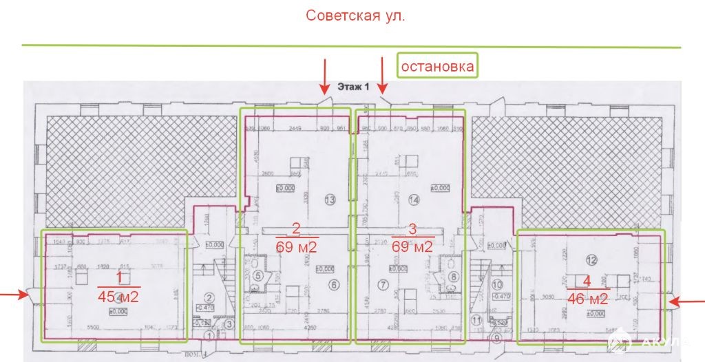 Помещение расположено на 1-м этаже кирпичного здания с железобетонными перекрытиями прямо на остановке общественного транспорта.