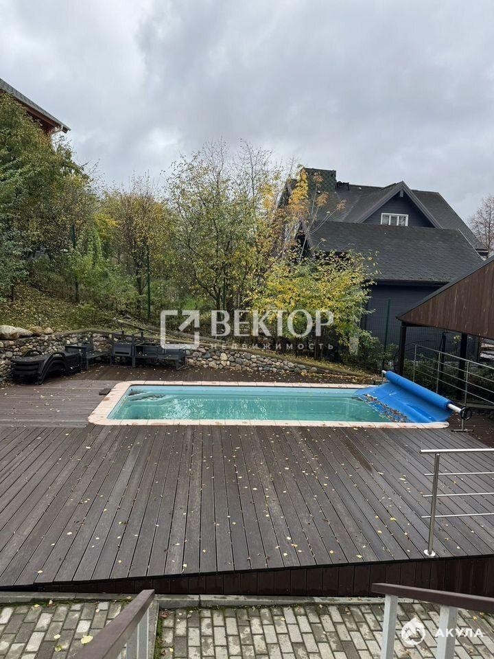 На территории создано идеальное пространство для жизни и отдыха: уличный бассейн с шезлонгами и зоной барбекю, площадка из благородной лиственницы, большой навес на две машины и уютная терраса для вечеров в кругу близких.