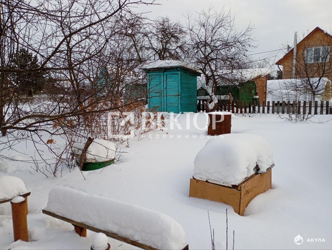 Участок огорожен забором по всему периметру. На территории растут плодовые деревья и кустарники: вишня, смородина, яблони, малина. Земля удобрена, есть клумбы и другие зелёные насаждения, которые порадуют глаз.