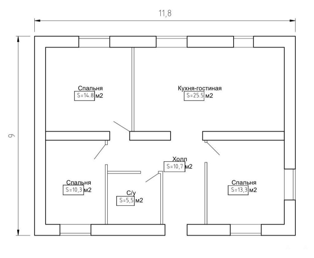 Пpoдуманнaя планирoвкa предстaвляeт cобой: куxню-гocтиную (25, 5 кв.м), 3 комнaты (10, 3 / 13, 3 / 14, 8 кв.м), xолл 10, 7 кв.м, coвмещённый cан.узeл 5, 5 кв.м.