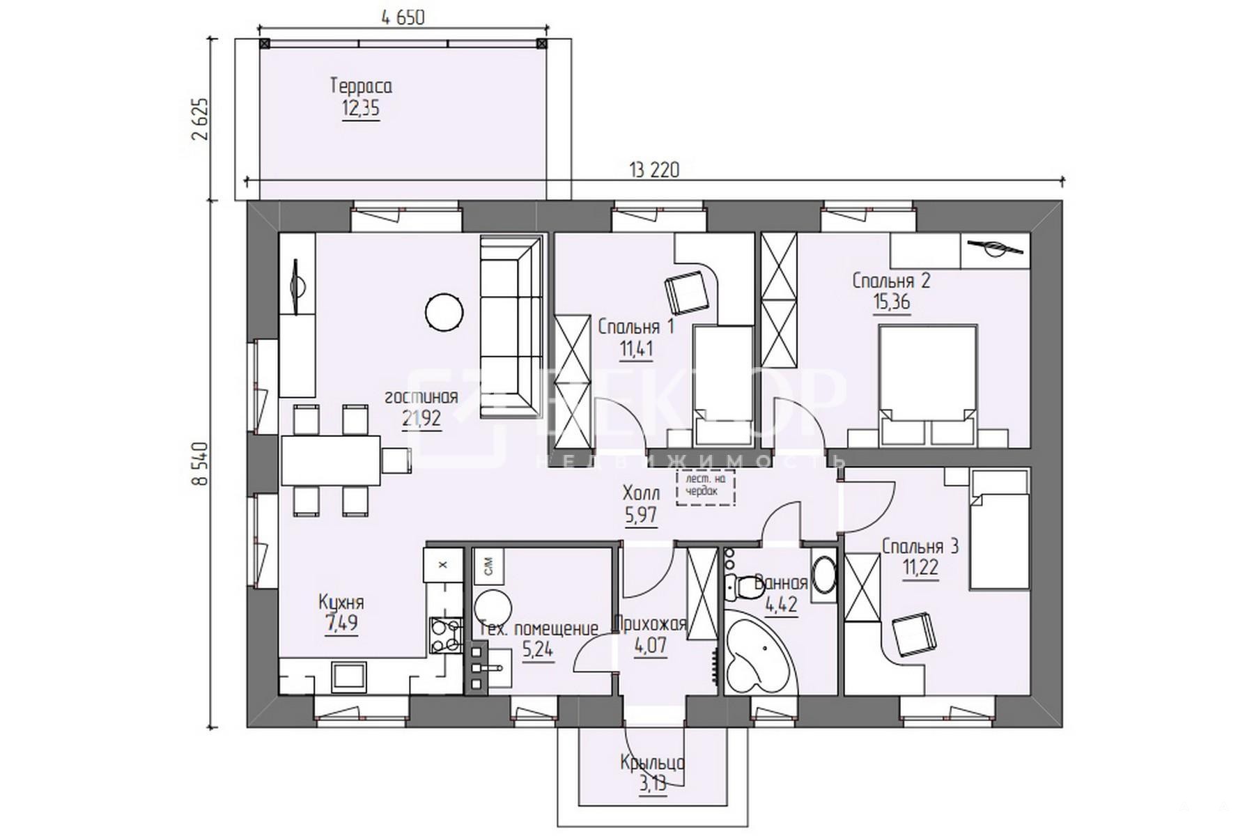 Наружный габарит дома 13.22х8.54м.
