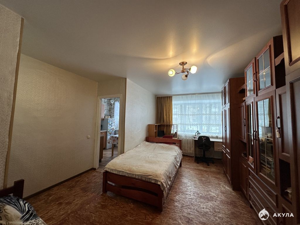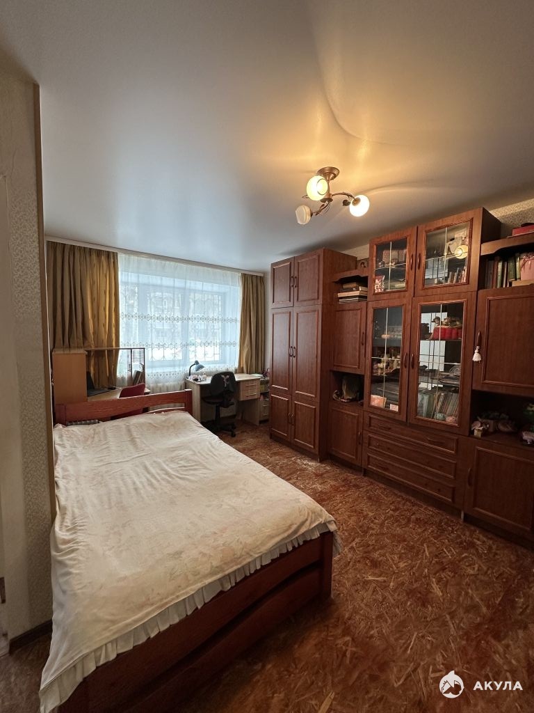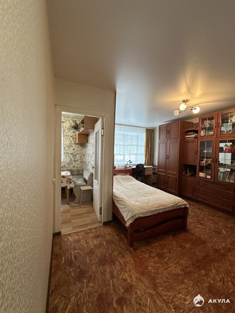 Комната площадью 18 кв.м., с встроенной кладовой ( место хранения вещей). Кухня-6, 5 кв.м, остается кухонный гарнитур, газовая плита и кухонный стол. По всей квартире заменена электро-проводка.