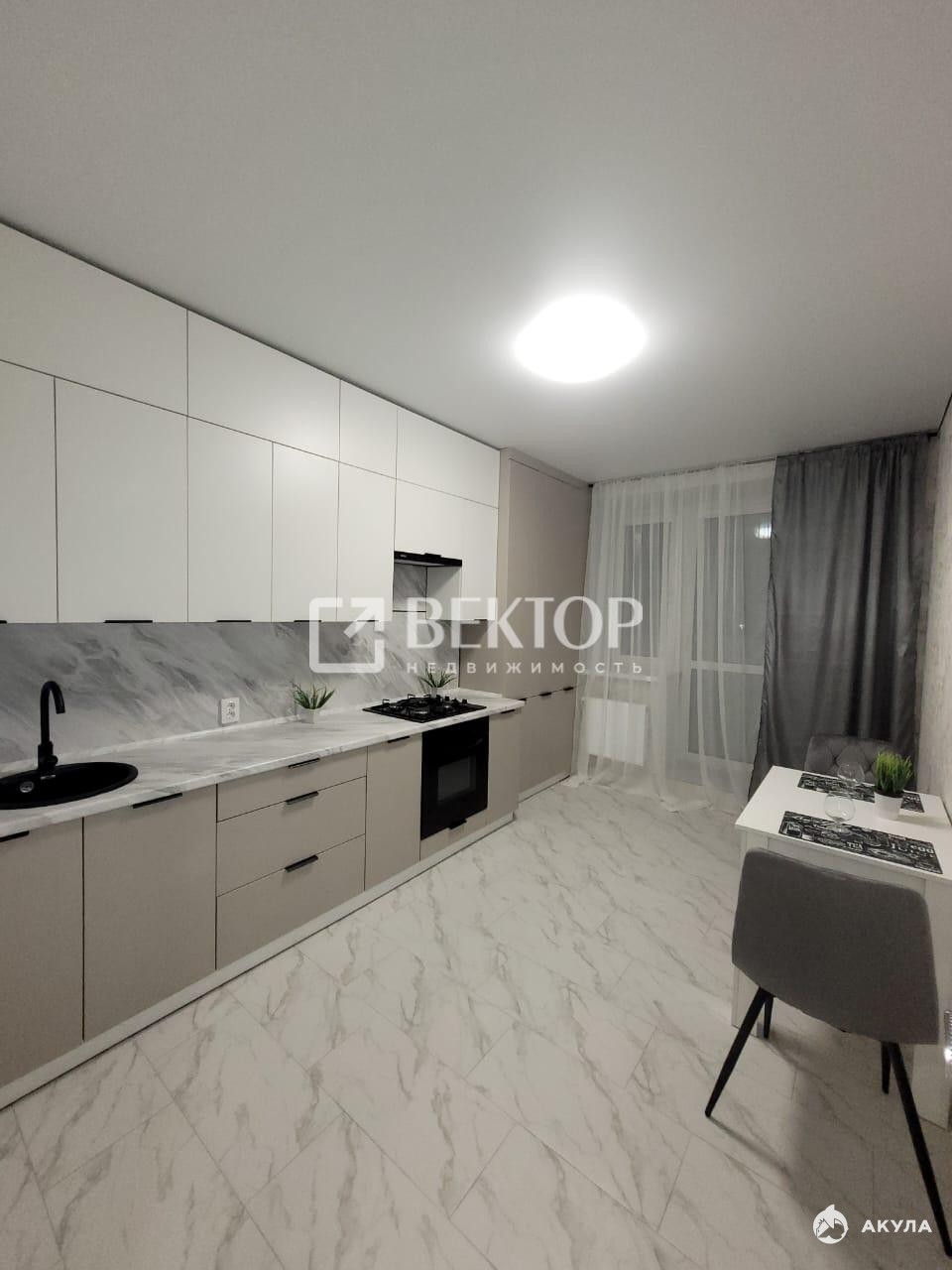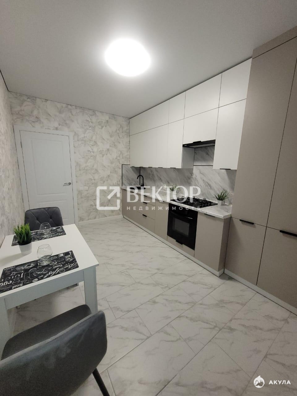 • Кухонный гарнитур с техникой: Встроенный кухонный гарнитур включает в себя варочную поверхность, духовой шкаф, вытяжку с подсветкой и современный смеситель. Обеденный стол и удобные стулья.