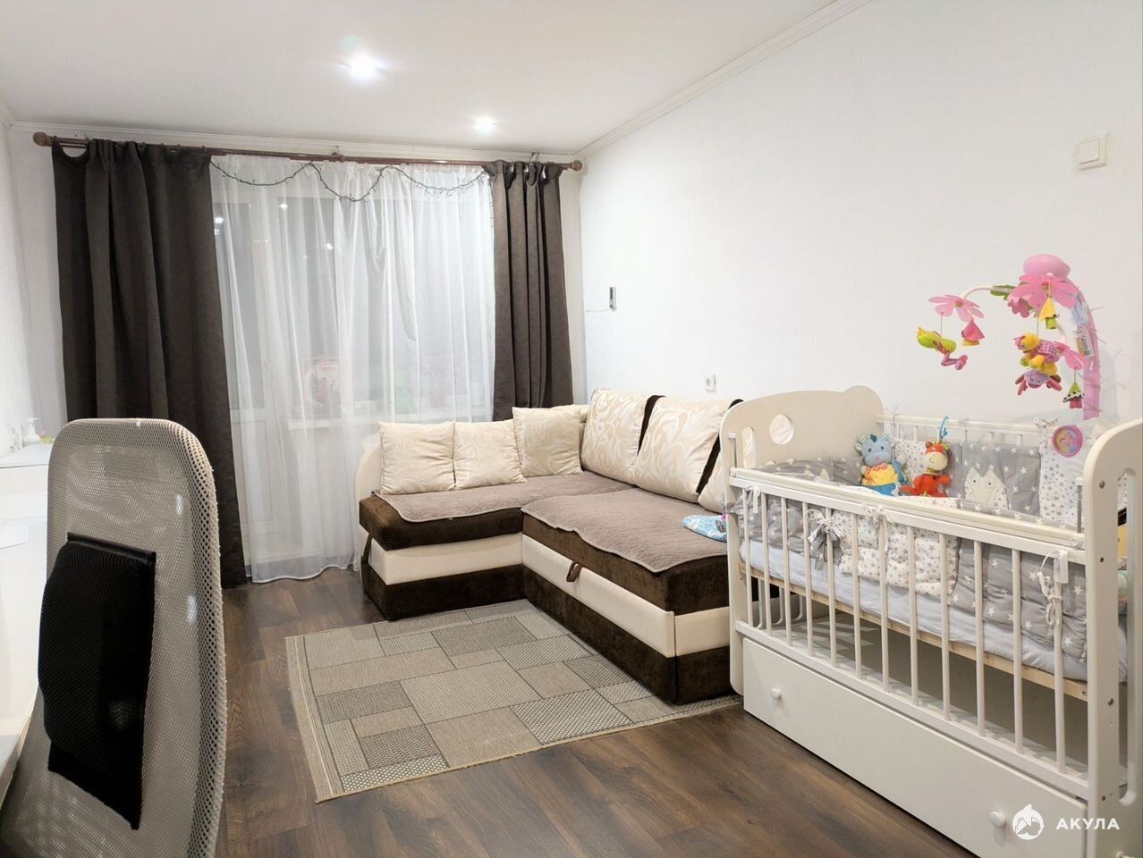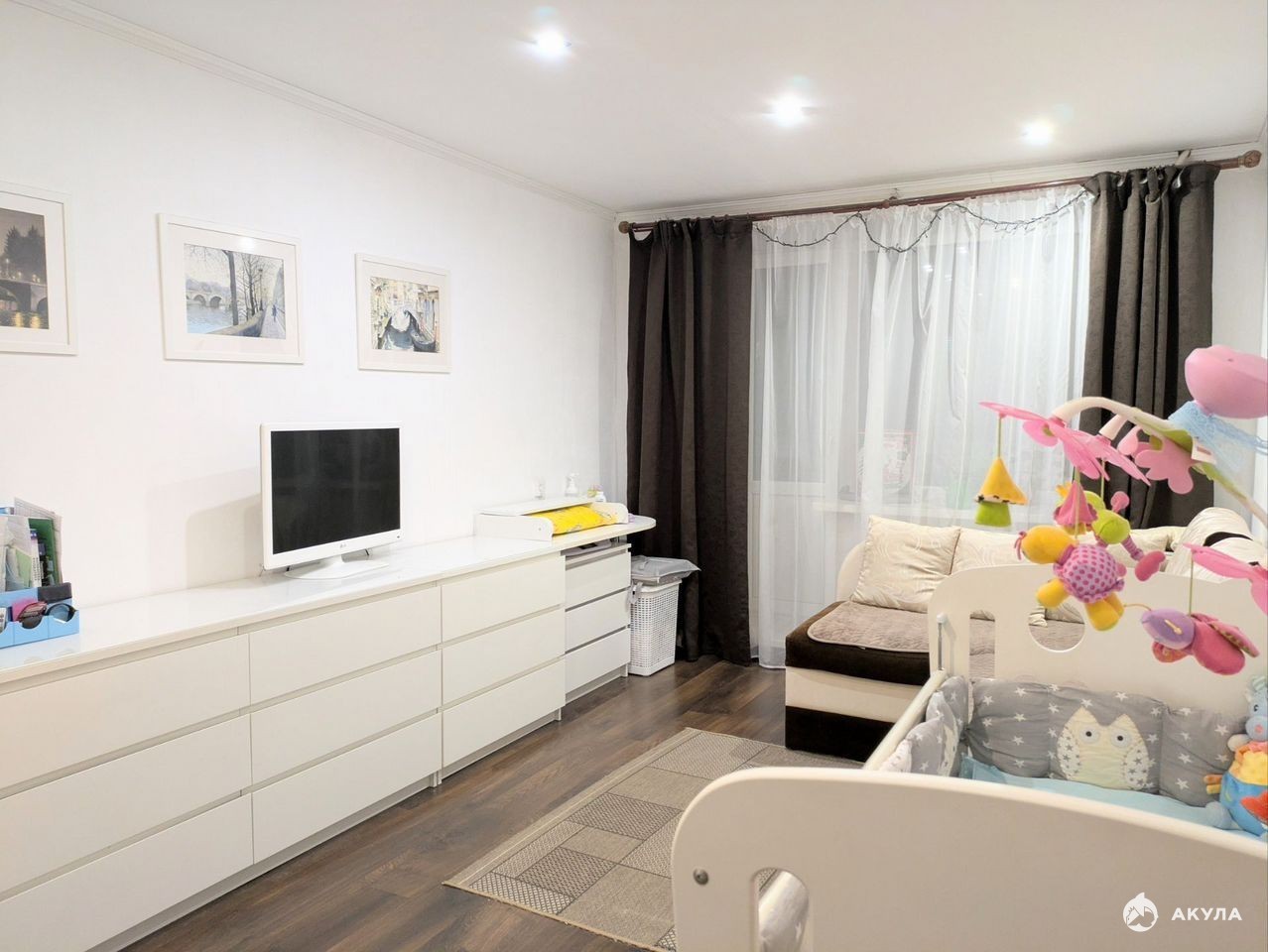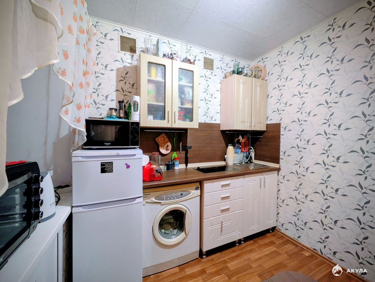 Просторная комната оформлена в светлых нейтральных тонах, есть встроенный шкаф-гардеробная и помещение для хранения вещей, благодаря чему мебели требуется по минимуму. Кухня оборудована встроенным гарнитуром с варочной поверхностью - достанется в подарок новым хозяевам.