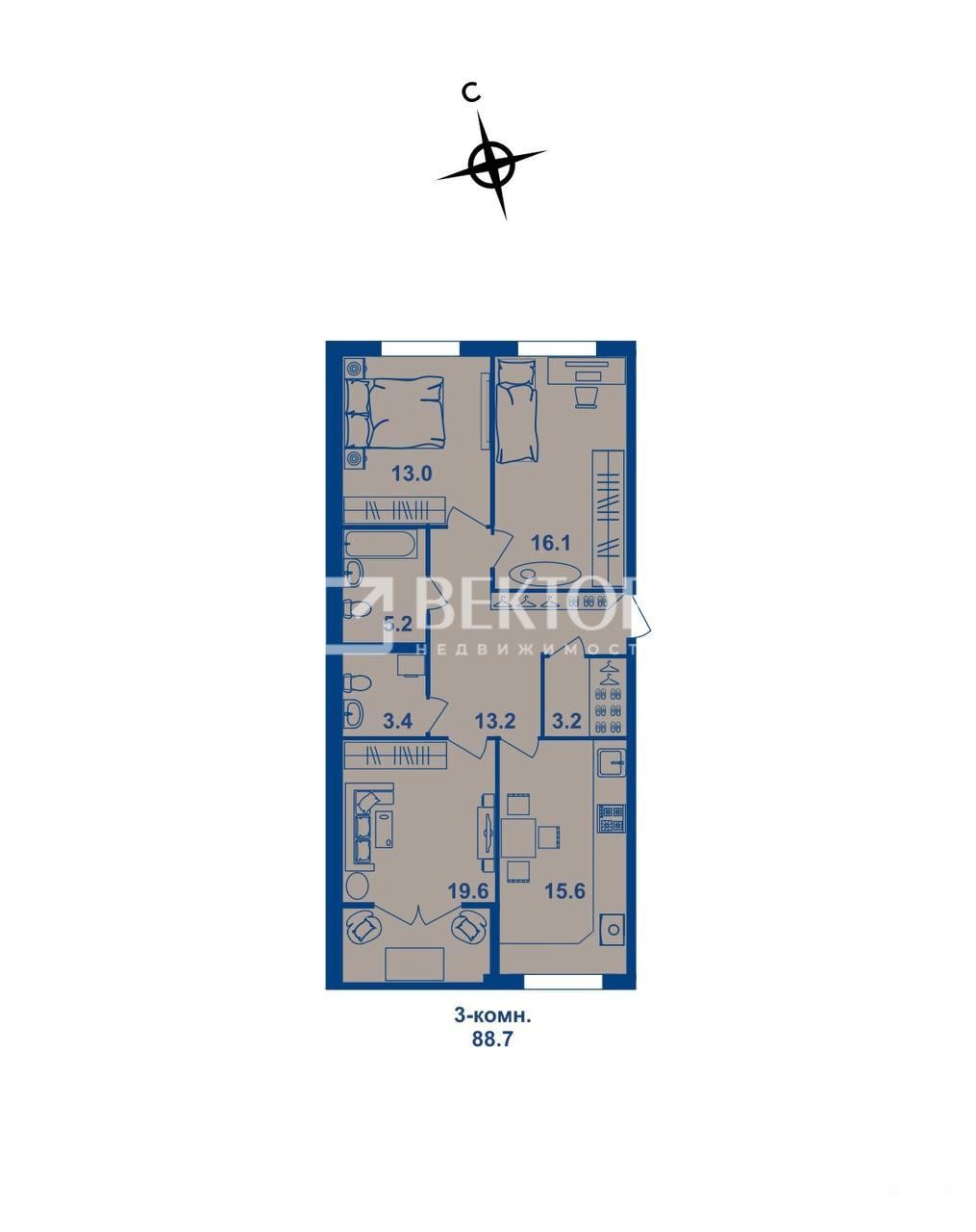 - В квартире три изолированные комнаты 13/16/19, 6 м2