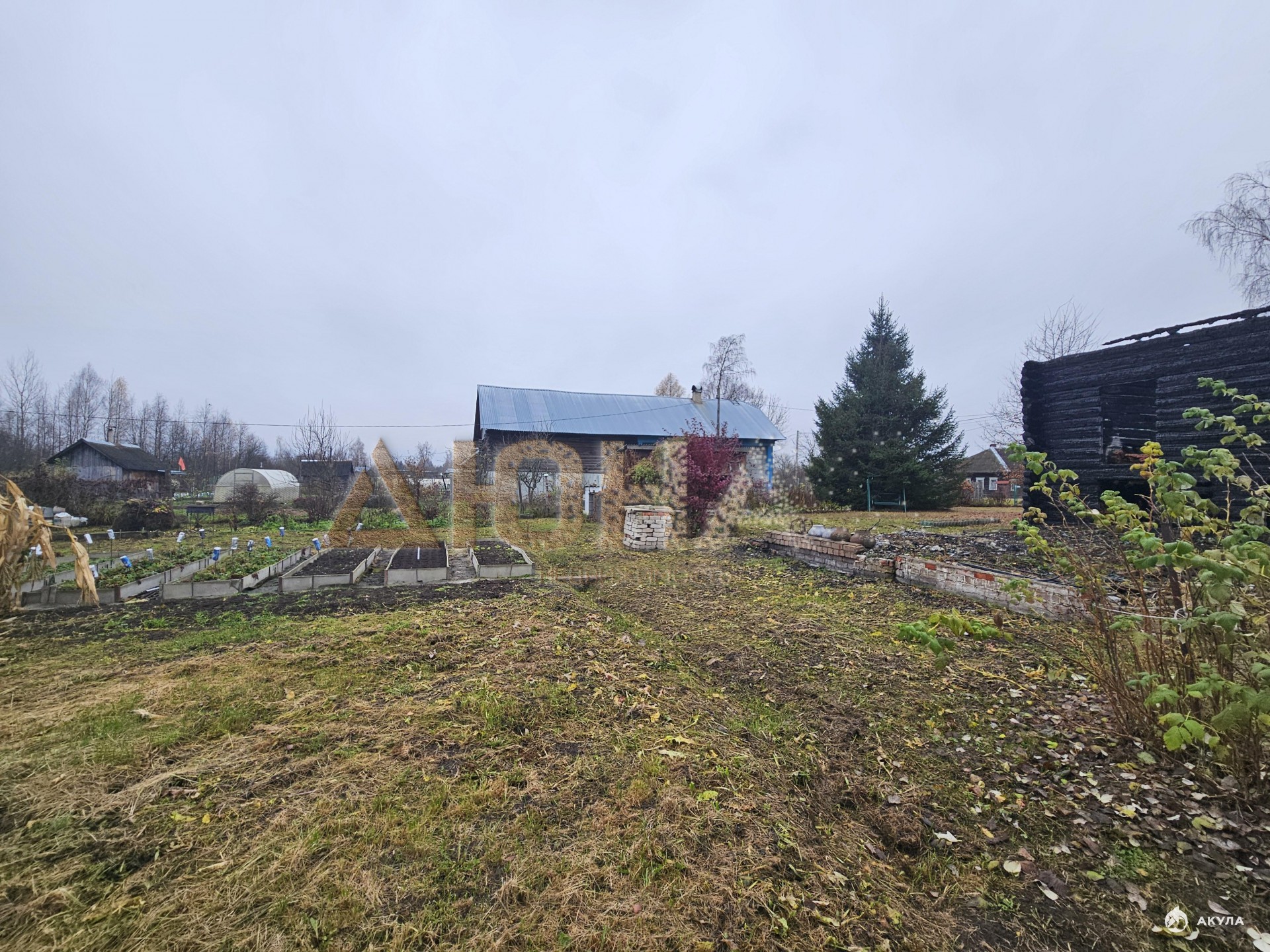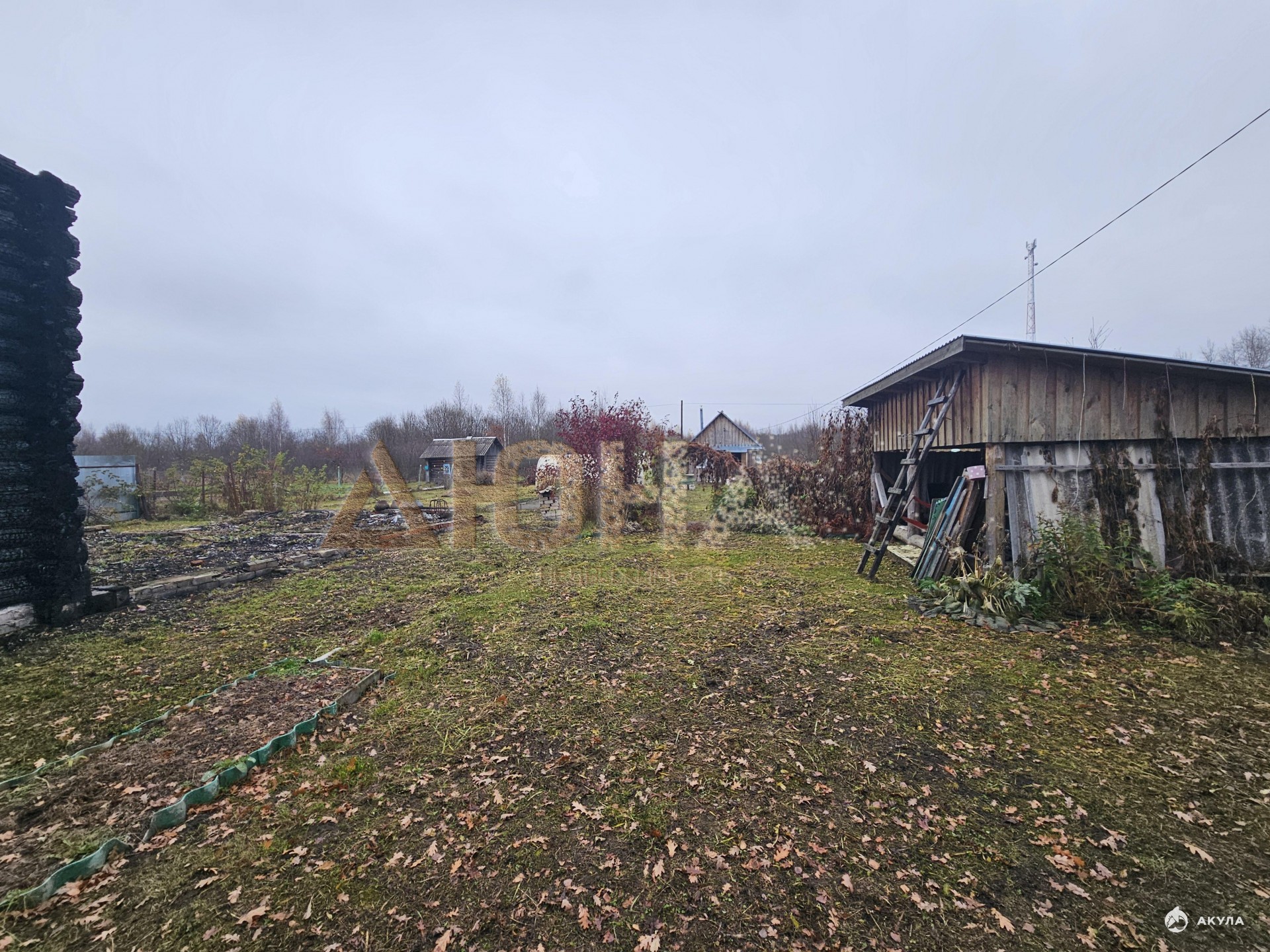 На участке имеются плодовые насаждения. стоит баня. Имеется фундамент после сгоревшего дома.