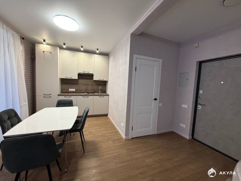 В квартире есть вся необходимая мебель и бытовая техника для комфортного проживания, а именно: кухонный гарнитур, варочная поверхность, вытяжка, стол и стулья, диван, стиральная машинка, холодильник.